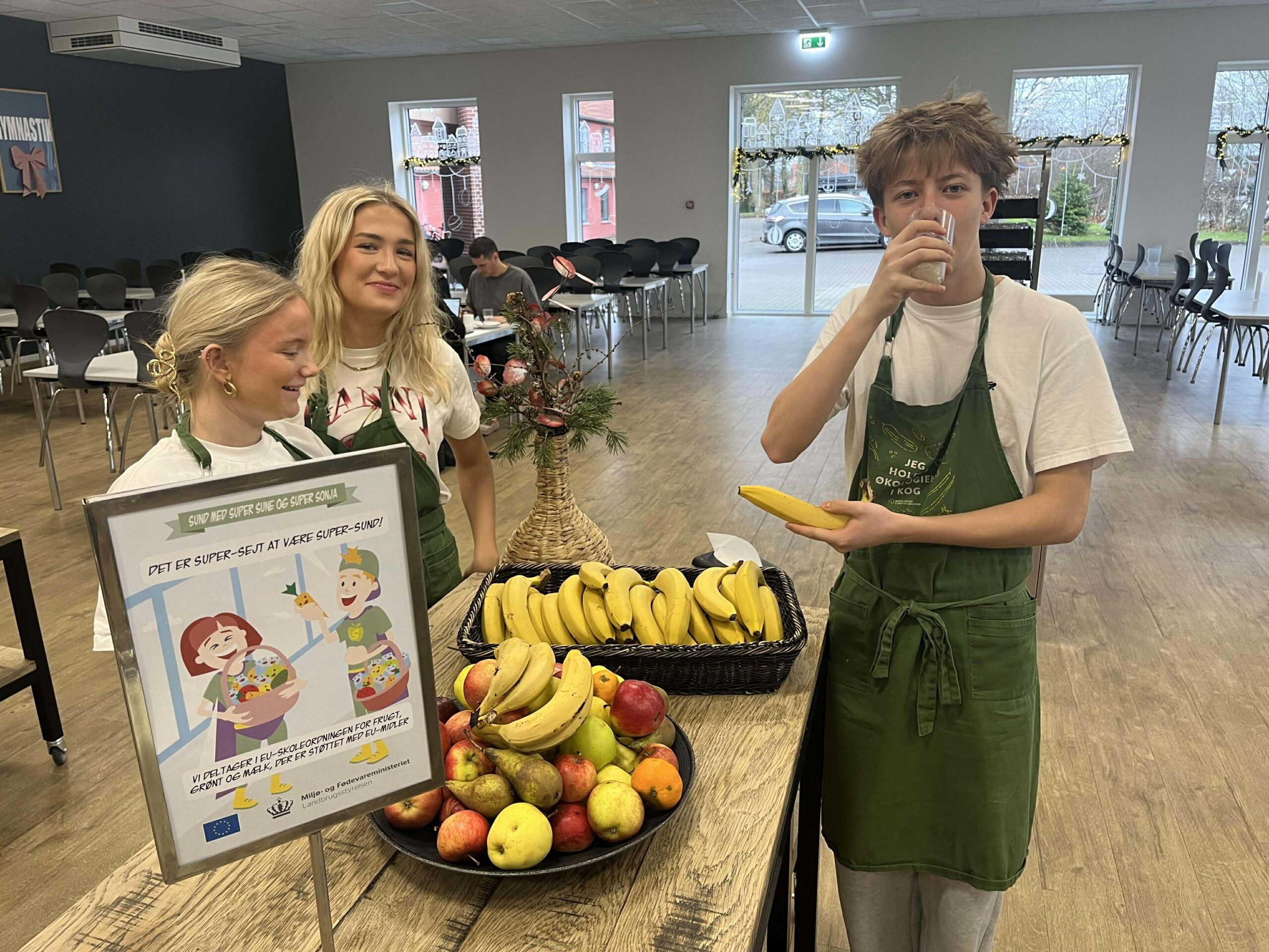 EU’s skoleordning har til formål at fremme sunde vaner hos børn ved at give elever i grundskolen og på efterskoler gratis eller billig frugt, grøntsager og mælk. Ordningen kombinerer uddeling af sunde fødevarer med undervisningsaktiviteter, hvor eleverne lærer om ernæring, landbrug og madens vej fra jord til bord. Målet er at styrke børn og unges sundhed, mindske sukkerforbruget og skabe en større forståelse for værdien af friske, lokale produkter. Når vore elever er i køkkenet, forsøger vi at lære dem om sunde kostvaner ligesom, der altid er grønne alternativer til måltiderne.